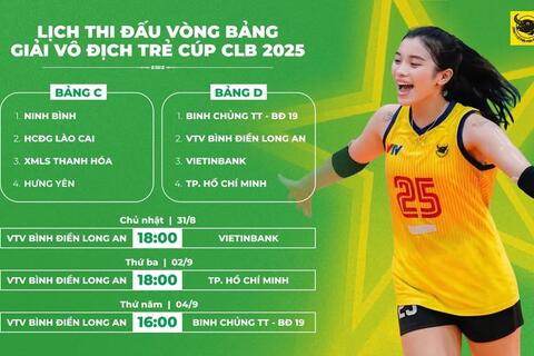 BỐC THĂM CHIA BẢNG VÀ LỊCH THI ĐẤU VÒNG BẢNG GIẢI VÔ ĐỊCH TRẺ CÚP CLB 2025Giải đấu sẽ diễn ra từ ngày 30/8 - 10/9/2025 tại NTĐ Tam Đảo, Phú ThọBảng C1. Ninh Bình2. HCĐG Lào Cai3. XMLS Thanh Hóa4. Hưng YênBảng D1. Binh Chủng TT – BĐ 192. VTV Bình Điền Long ...